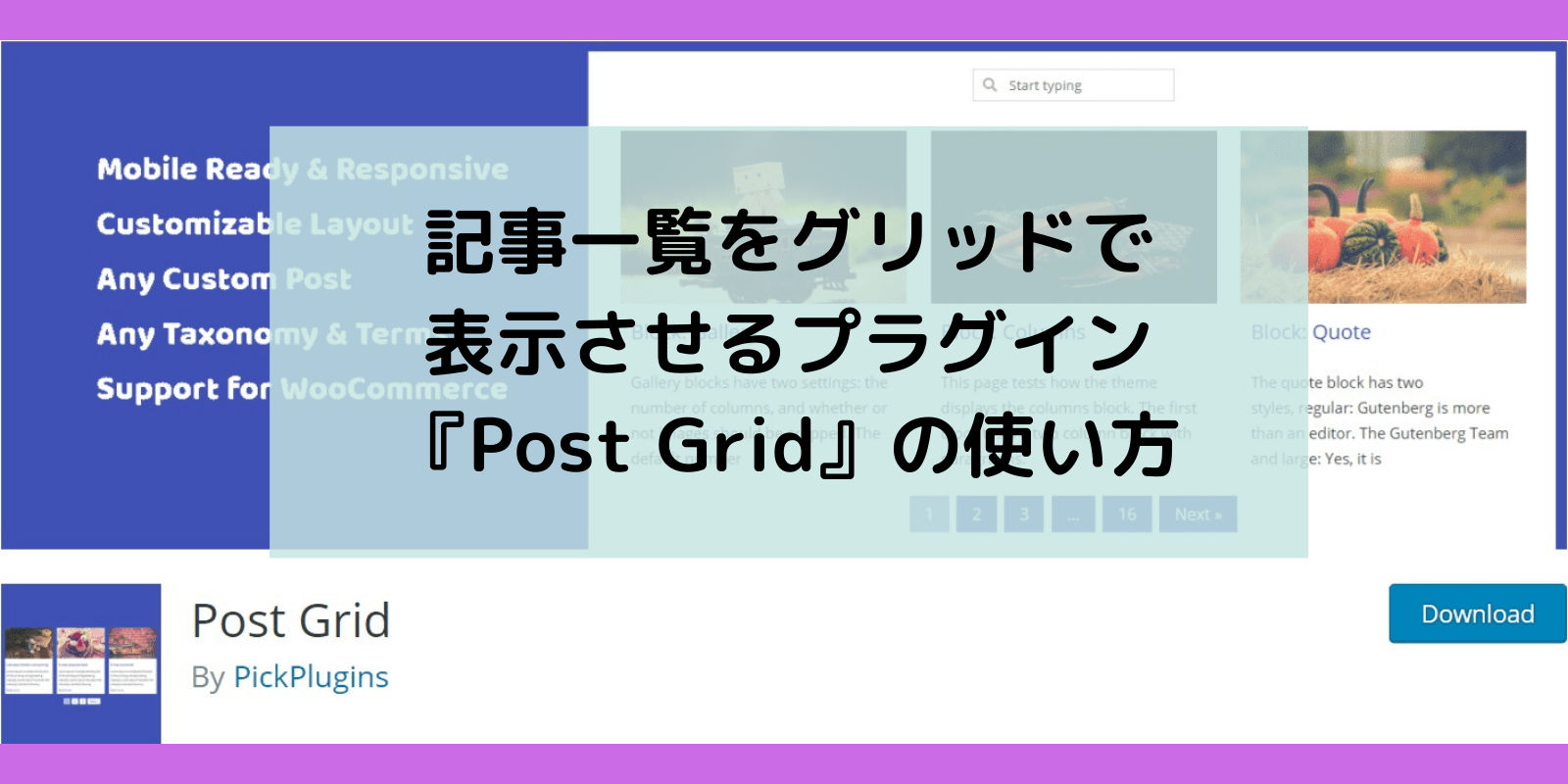 『Post Grid』とはPost(投稿)Grid(グリッド表示)という意味の通り、書いたブログの記事一覧を見た目よく表示させるプラグインです。