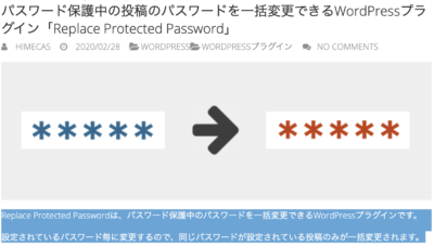プラグイン パスワードを一括変更できるWordPressプラグイン「Replace Protected Password」 Replace Protected Passwordは、パスワード保護中のパスワードを一括変更できるWordPressプラグインです。設定されているパスワード毎に変更するので、同じパスワードが設定されている投稿のみが一括変更されます。残念な... 2024.07.19 2024.07.20 0 プラグイン